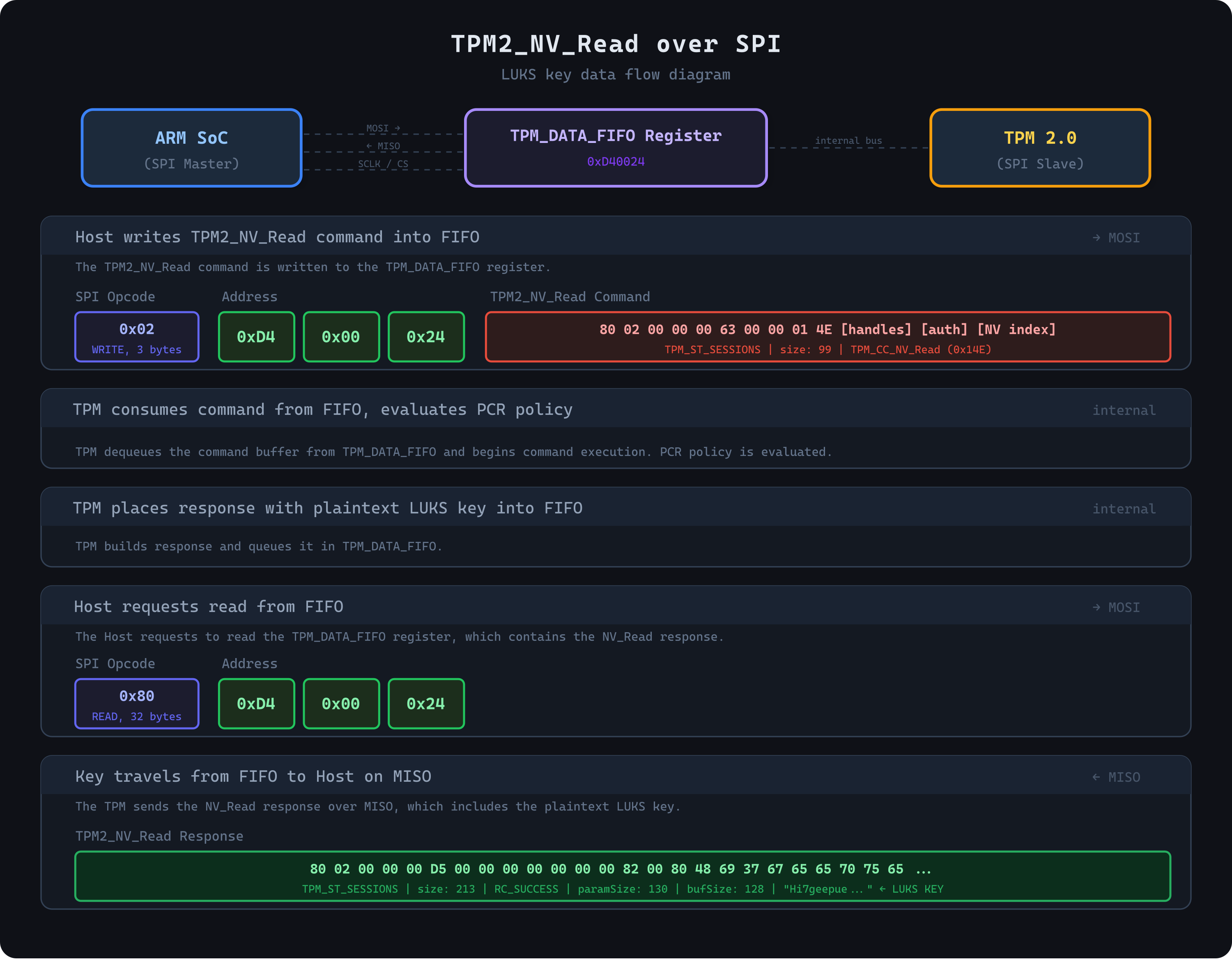 During boot on the Moxa UC-1222, the host SoC issues TPM commands to read the contents of this protected NV index as part of the TPM's structured command–response protocol. If the authorization policy is satisfied, the TPM returns the key material, which we will refer to as the LUKS disk key, to unlock the encrypted partition.