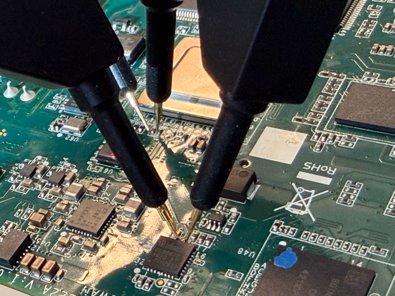 The CS and SCLK probes were attached to the Infineon TPM's SPI interface, while the MISO and MOSI probes were attached to measurement points along the same signal nets, instead of directly on the TPM's MISO and MOSI pins for easier attachment. The ground pin cannot be seen in the above figure, since it was attached to a ground point on the opposite side of the PCB.
