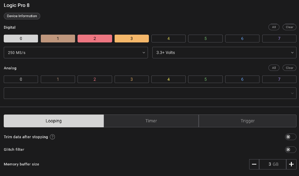 Logic 2 was configured to use a reading speed of 250 MS/s at 3.3+ Volts for the full bootup time, which was around ~50 seconds.