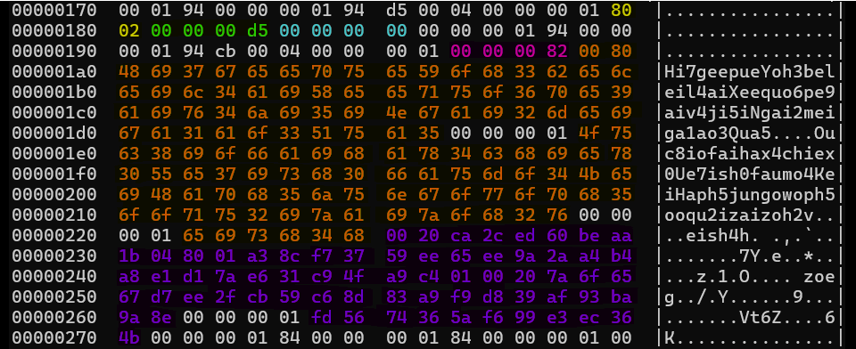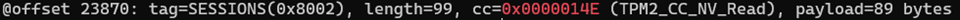 Table 14 in TCG's TPM2 Part 2: Structures document reveals the command code that we are interested in7. The TPM_CC_NV_Read command corresponds to the 0x0000014E command code. The tpm2_spi_decoder script can parse the data and provide offsets and command codes for the MOSI stream. If we grep for 0x0000014E we can see the following:
