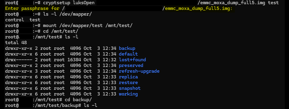 The encrypted image was then mounted, at which point the passphrase, or LUKS device key, was entered. The screenshot below shows the image being successfully mounted after entering the passphrase. This validates that the sniffed passphrase is correct.