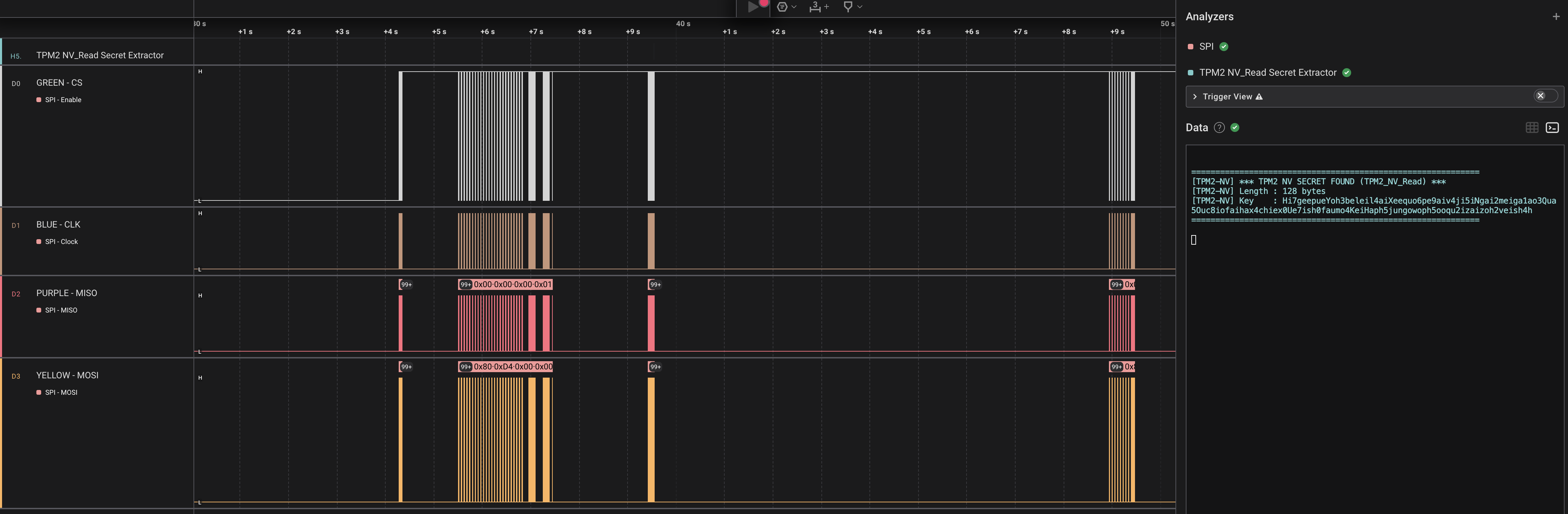 Which tells us the offset where the TPM_CC_NV_Read command is sent. In order to see the response, we need to analyze the MISO stream around that offset. The tpm_spi_carve.py script provides that feature with the following flags. Alternatively, we can use the tpmstream program provided by the tpm2-software community8.